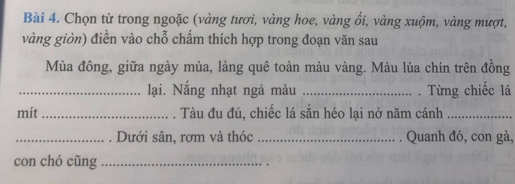 Bài 4. Chọn từ trong ngoặc (vàng tươi, vàng hoe, vàng ối, vàng xuộm, vàng mượt,