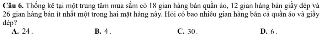 Ta có: Gọi A là số gian hàng bán quần áo=> n(A)=18