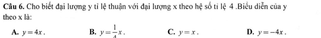 đại lượng y tỉ lệ thuận với đại lượng x theo hệ số tỉ lệ 4