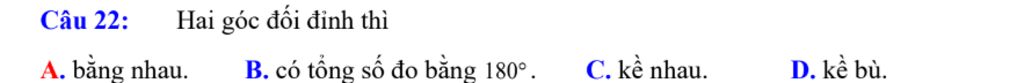 Hai góc đối đỉnh là hai góc mà mỗi cạnh của góc này là tia đối của một cạnh góc kia và có số đo bằng nhau
