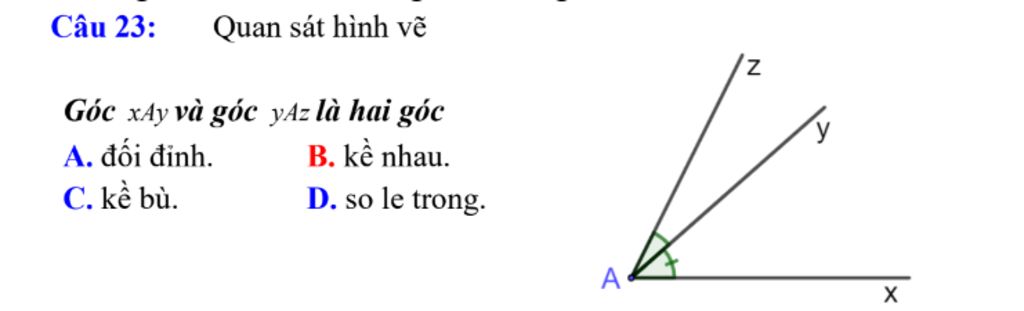 `-> \hat{xAy}` và `\hat{yAz}` là `2` góc kề nhau có chung đỉnh A