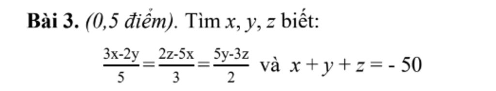 `(3x-2y)/5=(2z-5x)/3=(5y-3z)/2` suy ra `(15x-10y)/25=(6z-15x)/9=(10y-6z)/2`