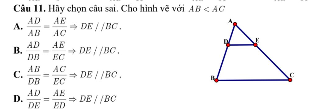 Thalès chỉ được áp dụng khi `Delta ADE` $\backsim$ `Delta ABC` trong trường hợp đề bài chưa cho cạnh.