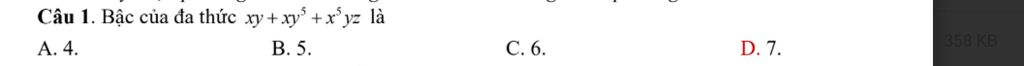 `x^5yz` có bậc là `5 + 1 + 1 = 7`