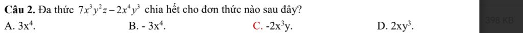 `bb D:`Không chia hết vì `7x^3y^2z` không chia hết `2xy^3(y^2 lt y^3)`