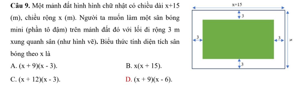 Biểu thức biểu thị diện tích sân bóng theo `x` là: