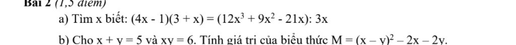 `(4x-1).(3+x)=(12x^{3}+9x^{2}-21x):3x` `(đk:ne0)`