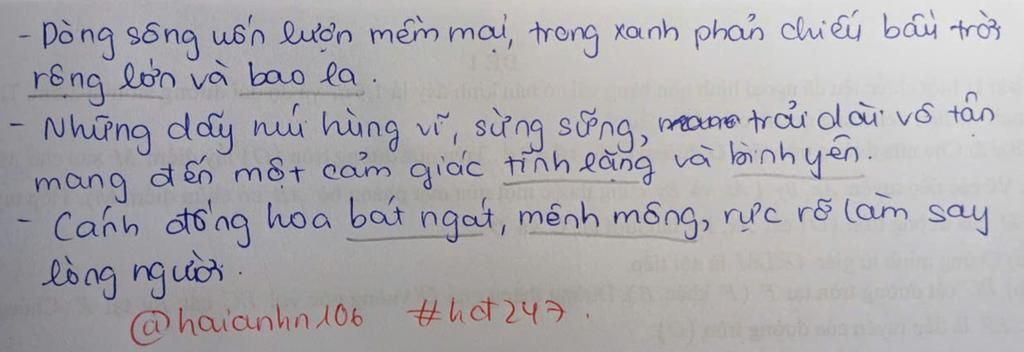 Ở quê em tuy bình dị nhưng lại mang vẻ đẹp thanh bình và yên ả . Xa xa nhìn con suối mềm mại như dải lụa . Con suối quanh có uốn lượn quanh làng . Đi thêm một đoạn nữa sẽ thấy một cánh đồng rộng bát ngát với những bông lúa chín vàng . Mỗi lần về quê , được hít thơ không khí trong lành và mát mẻ , em cảm thấy quê mình đẹp biết bao !