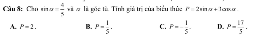 `->cos\alpha=3/5(ktmđk)` hoặc `cos\alpha=-3/5(tmđk)`