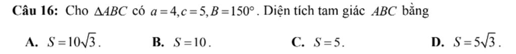 `triangle ABC` có `a = 4; c =5; hat{B} = 150^o`