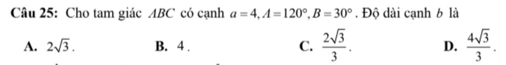 Trong tam giác `ABC` có: `a=4;\hat{A}=120^{o};\hat{B}=30^{o}`