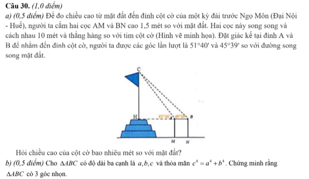 a) (0,5 điểm) Để đo chiều cao từ mặt đất đến đỉnh cột cờ của một kỳ đài trước Ngọ Môn (Đại Nội - Huế), người ta cắm hai cọc AM và BN cao 1,5 mét so với mặt đất. Hai cọc này song song và cách nhau 10 mét và thẳng hàng so với tim cột cờ (Hình vẽ minh họa). Đặt giác kế tại đỉnh A và B để nhắm đến đỉnh cột cờ, người ta được các góc lần lượt là 51°40' và 45°39' so với đường song song mặt đất. Hỏi chiều cao của cột cờ bao nhiêu mét so với mặt đất?