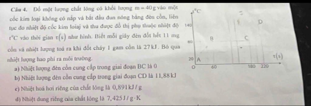 Trong giai đoạn `BC`, `m=40 \ g` chất lỏng được hóa hơi hoàn toàn