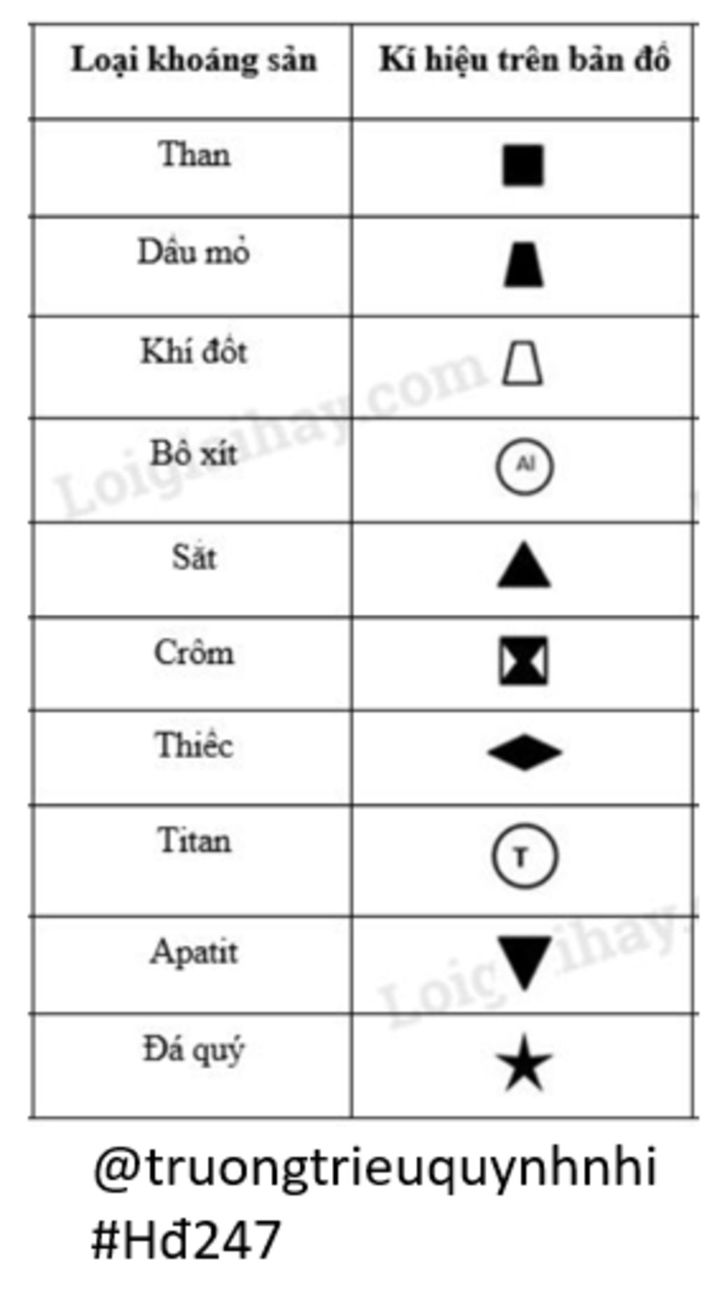 Qua `vd,` ta có thể thấy các mỏ khoáng sản được biểu diễn bằng kí hiệu hình học (than: hình vuông đen, dầu mỏ: tam giác đen, ...)