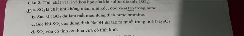 `a,` sai ý "ít tan trong nước", `SO_2` là hợp chất phân cực nên tan được trong nước (dung môi phân cực)
