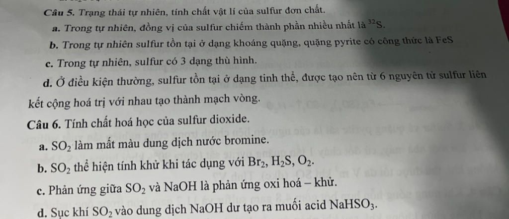 `b)` Sai, `SO_2` thể hiện tính oxi hóa khi tác dụng với `H_2S`