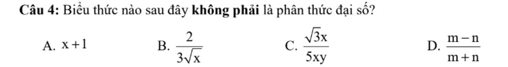 `=> 2/( 3\sqrt{x})` không là phân thức đại số