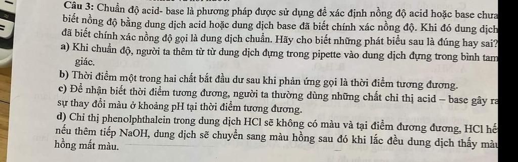 `c)` Đúng, khi chất chỉ thị đổi màu thì dừng chuẩn độ