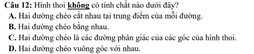 Câu 12: Hình thoi không có tính chất nào dưới đây?