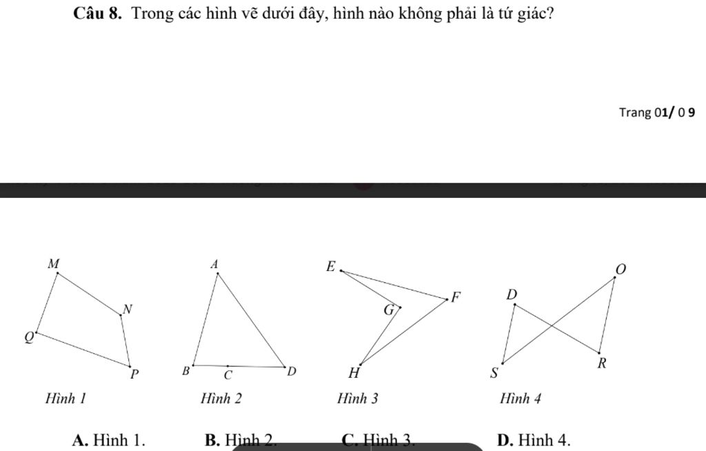 Tứ giác là hình có 4 đỉnh và 4 cạnh, trong đó không có bất kỳ 2 đoạn thẳng nào cùng nằm trên 1 đường thẳng