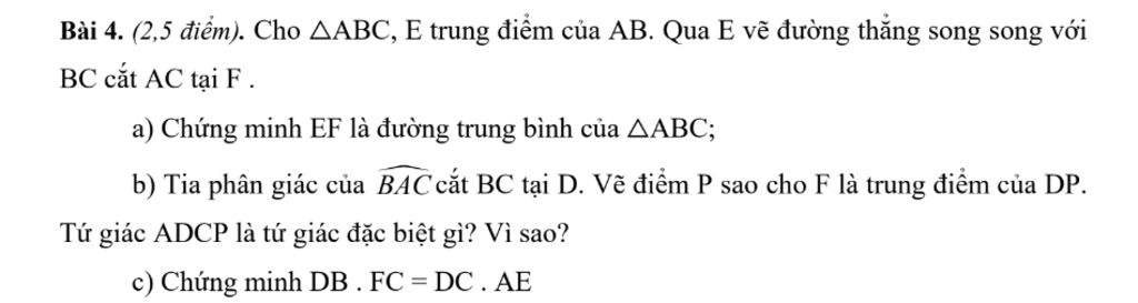 Bài 4. (2,5 điểm). Cho $\triangle \mathrm{ABC}, \mathrm{E}$ trung điểm của AB . Qua E vẽ đường thẳng song song với BC cắt AC tại F .