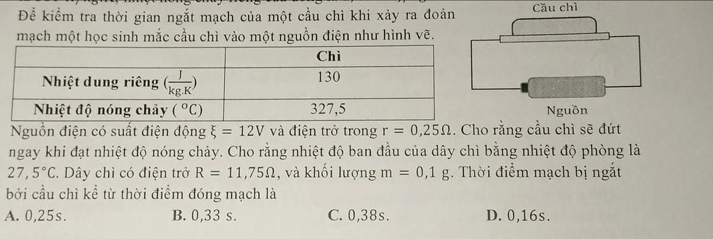 \(t = \dfrac{Q}{{{I^2}R}} = \dfrac{{3,9}}{{{1^2}.11,75}} = 0,332\left( s \right)\)