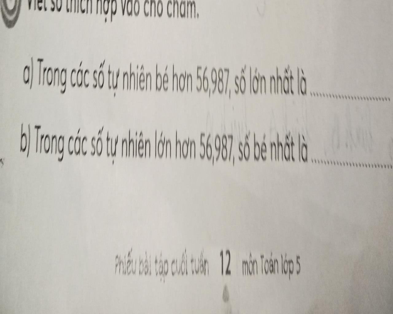 `a )` Trong các số tự nhiên bé hơn `56,987` , số lớn nhất là : `56`