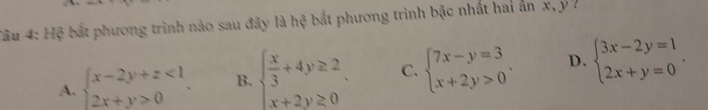 `A.` Loại vì `x-2y+z<1` là bất phương trình 3 ẩn.