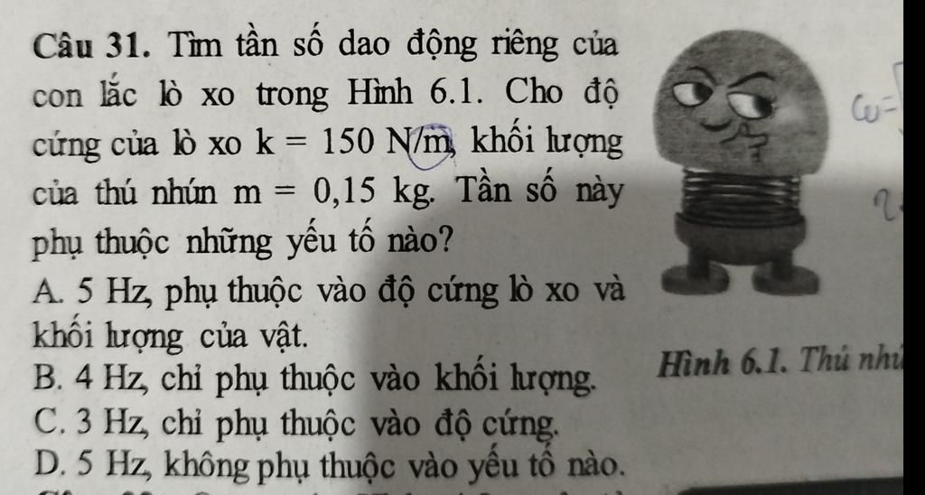 `f = 1/(2\pi \sqrt{m/k}) = 1/(2\pi \sqrt{(0,15)/150}) ≈ 5` (Hz)