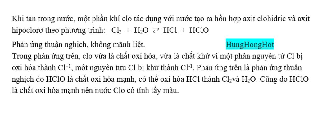 `->` $\rm Cl_2$ không phản ứng mãnh liệt với $\rm H_2O$ , cụ thể có là phản ứng này là phản ứng thuận nghịch , không dống như $\rm Na$ khi gặp nước sẽ phản ứng rất mãnh liệt .