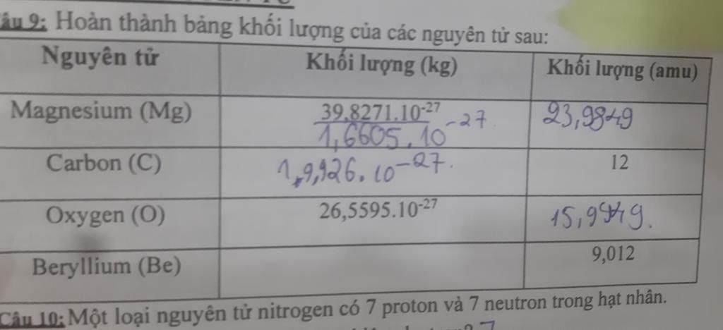 âu 9: Hoàn thành bảng khối lượng của các nguyên tử sau:
