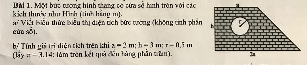Diện tích bức tường là:$\frac{3.a.h}{2}$ - r².3,14(m²)