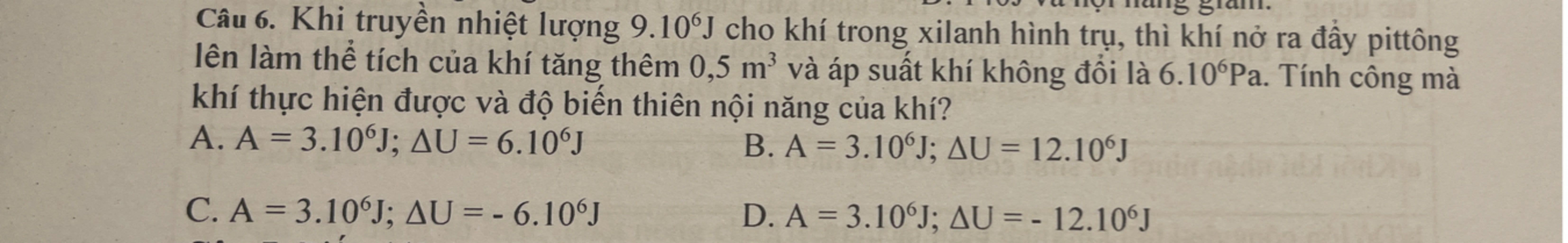 \(\Delta U = Q - U = {9.10^6} - {3.10^6} = {6.10^6}J\)
