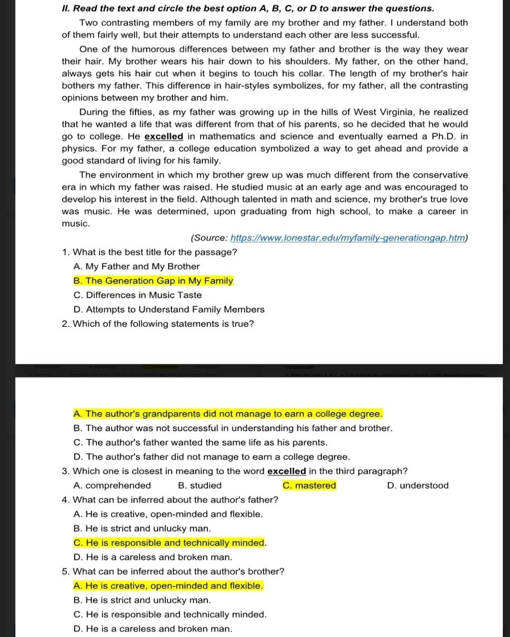 (Đáp án B, bởi vì bài này nói rộng hơn, nhấn mạnh chủ đề rộng hơn về sự khác biệt giữa các thế hệ trong gia đình, thay vì chỉ tập trung vào bố và anh trai)