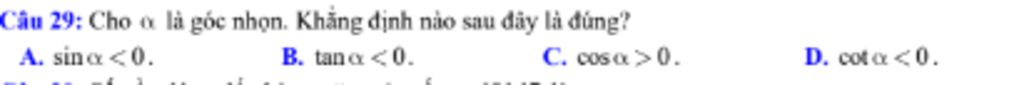 Với `alpha` là góc nhọn thì `{(sin alpha>0),(cos alpha>0),(tan alpha>0),(cot alpha>0):}` vì `alpha` thuộc gp4 thứ nhất