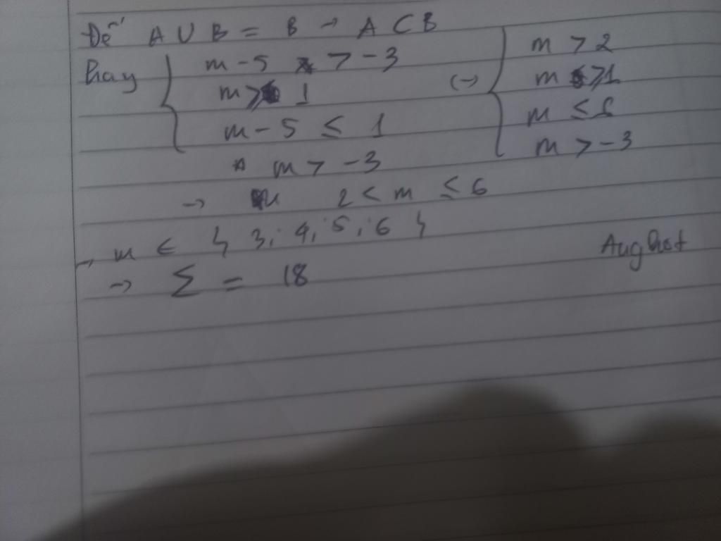 Cho hai tập hợp A = [m–5;1], B = (-3;m]. Tính tổng tất cả các giá trị nguyên của m để AUB =