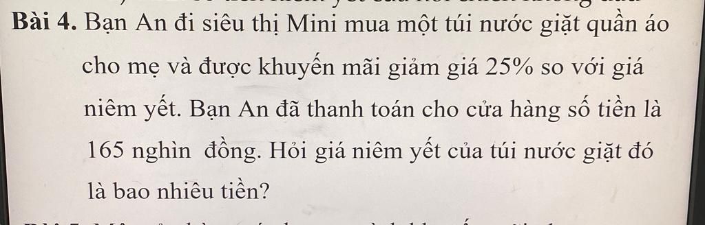 `165 000 : (100% - 25% ) = 220 000` ( đồng )