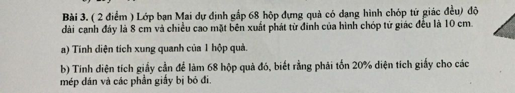 Bài 3. ( 2 điểm ) Lớp bạn Mai dự định gấp 68 hộp đựng quà có dạng hình chóp tứ giác đều) độ