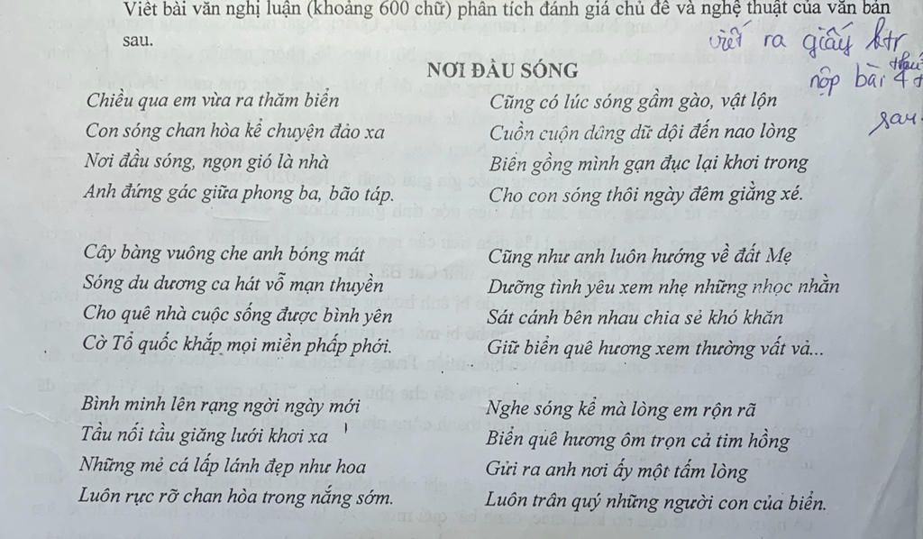 Bài thơ" Nơi đầu sóng" là một bản nhạc trữ tình khắc họa tình yêu đất nước, đặc biệt là thông qua hình ảnh người chiến sĩ để nhấn mạnh ý thức trách nhiệm bảo vệ biển đảo quê hương mình. Mở đầu bài thơ, tác giả đã gửi gắm hồn mình trên trang viết: