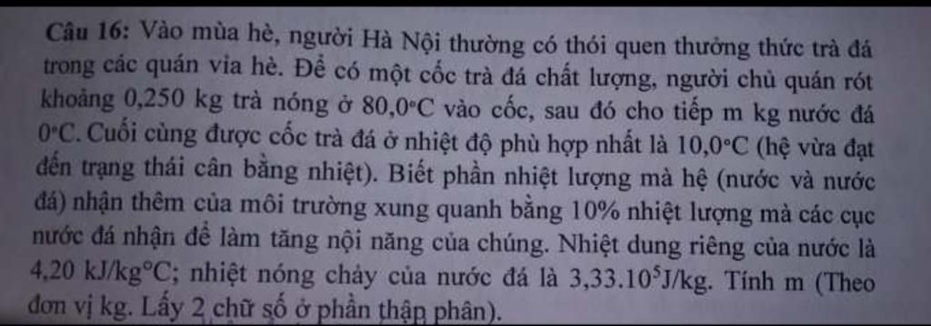 khoảng 0,250 kg trà nóng ở 80,0 C vào cốc, sau đó cho tiếp m kg nước đã