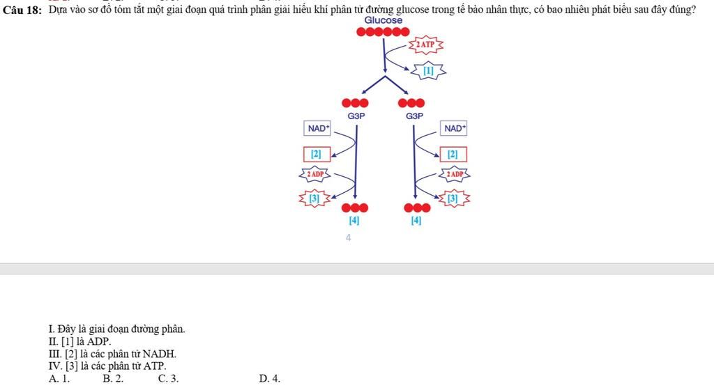 IV.Đúng. Sau khi biến đổi sản phẩm thành Pyruvic Acid [4], năng lượng được tích lũy vào P và được gắn lại với ADP thành ATP