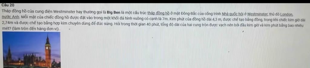 Độ dài cung tròn mà đầu kim giờ vạch lên là: