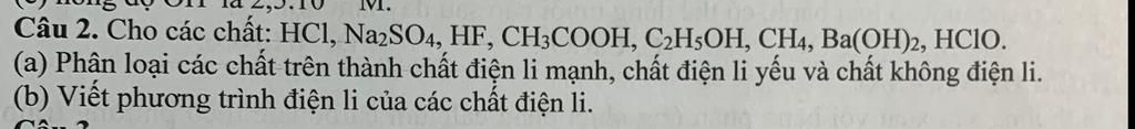 Điện ly yếu: `HF, CH_3COOH, HClO`