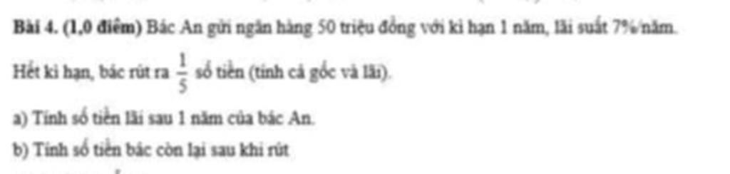 Bài 4. (1,0 điểm) Bác An gửi ngân hàng 50 triệu đồng với ki hạn 1 năm, lãi suất 7% năm.