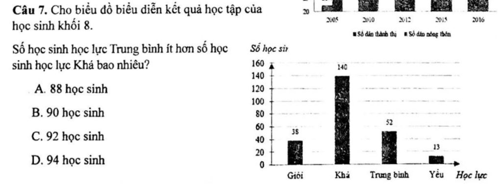 `to`Số học sinh trung bình ít hơn số học sinh khá là:`140 - 52 = 88`(học sinh)