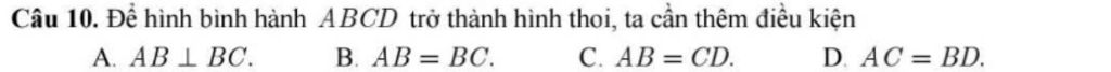 `-`Để hình bình hành `ABCD` trở hành hình thoi,ta cần thêm `AB = BC`(Vì `2` cạnh này là `2` cạnh kề)