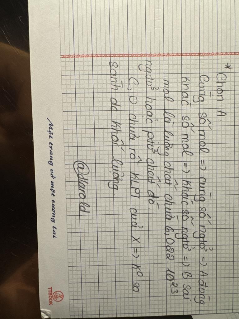 `A` Đúng, cùng số mol thì có cùng số nguyên tử