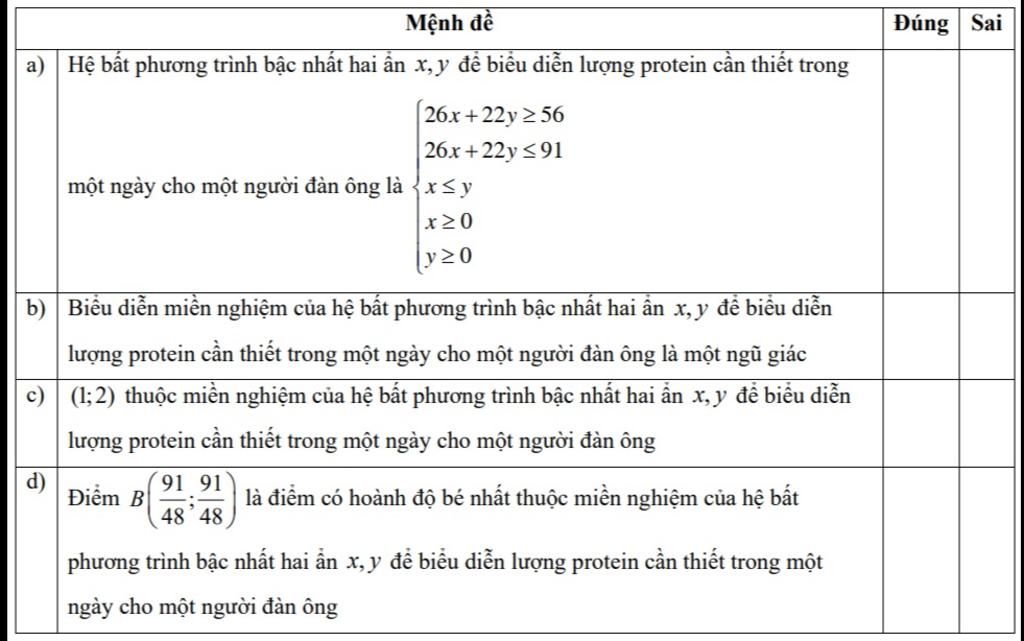 Câu 7. Trong 1 lạng thịt bò chứa 26g protein, 1 lạng cá chứa 22g protein. Trung bình trong một ngày, một người đàn ông cần từ 56 đến 91g protein. Theo lời khuyên của bác sĩ, để tốt cho sức khỏe thì không nên ăn thịt nhiều hơn cá. Gọi x, y lần lượt là số lạng thịt bò, lạng cá mà một người đàn ông ăn trong một ngày. Các mệnh đề sau đúng hay sai?