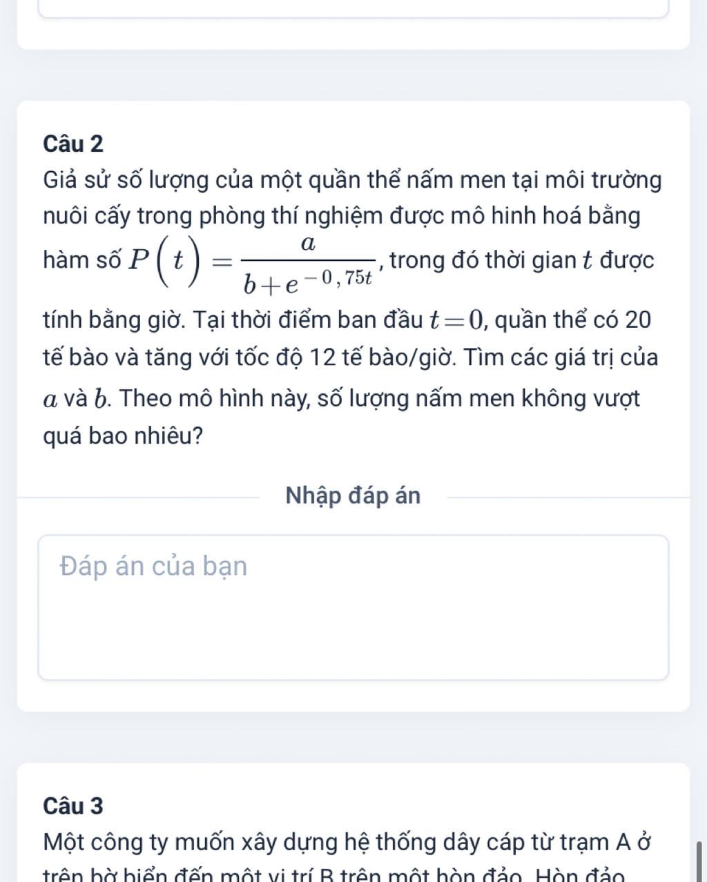 $\to \begin{cases}20=\dfrac{a}{b+e^{-0.75\cdot 0}}\\ P(1)-20=12\end{cases}$