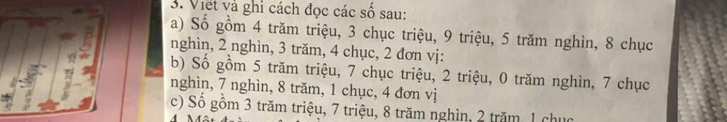 ` a) 439582342 ` được đọc là ` : ` Bốn trăm ba mươi chín triệu năm trăm tám mươi hai nghìn ba trăm bốn mươi hai